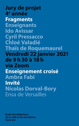 à 09:00Fragments Ido Avissar Cyril Pressacco Chloé Valadié Thaïs de Roquemaurel Enseignement croisé Ambra Fabi Invité Nicolas Dorval-Bory, Ensa de…