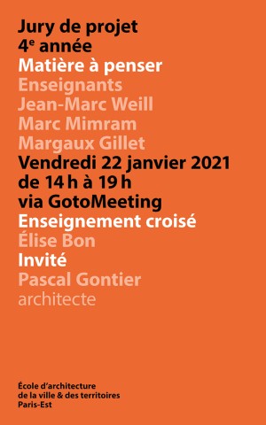 à 14:00Matière à penser Jean-Marc Weill Marc Mimram Margaux Gillet Enseignement croisé Élise Bon Invité Pascal Gontier, architecte