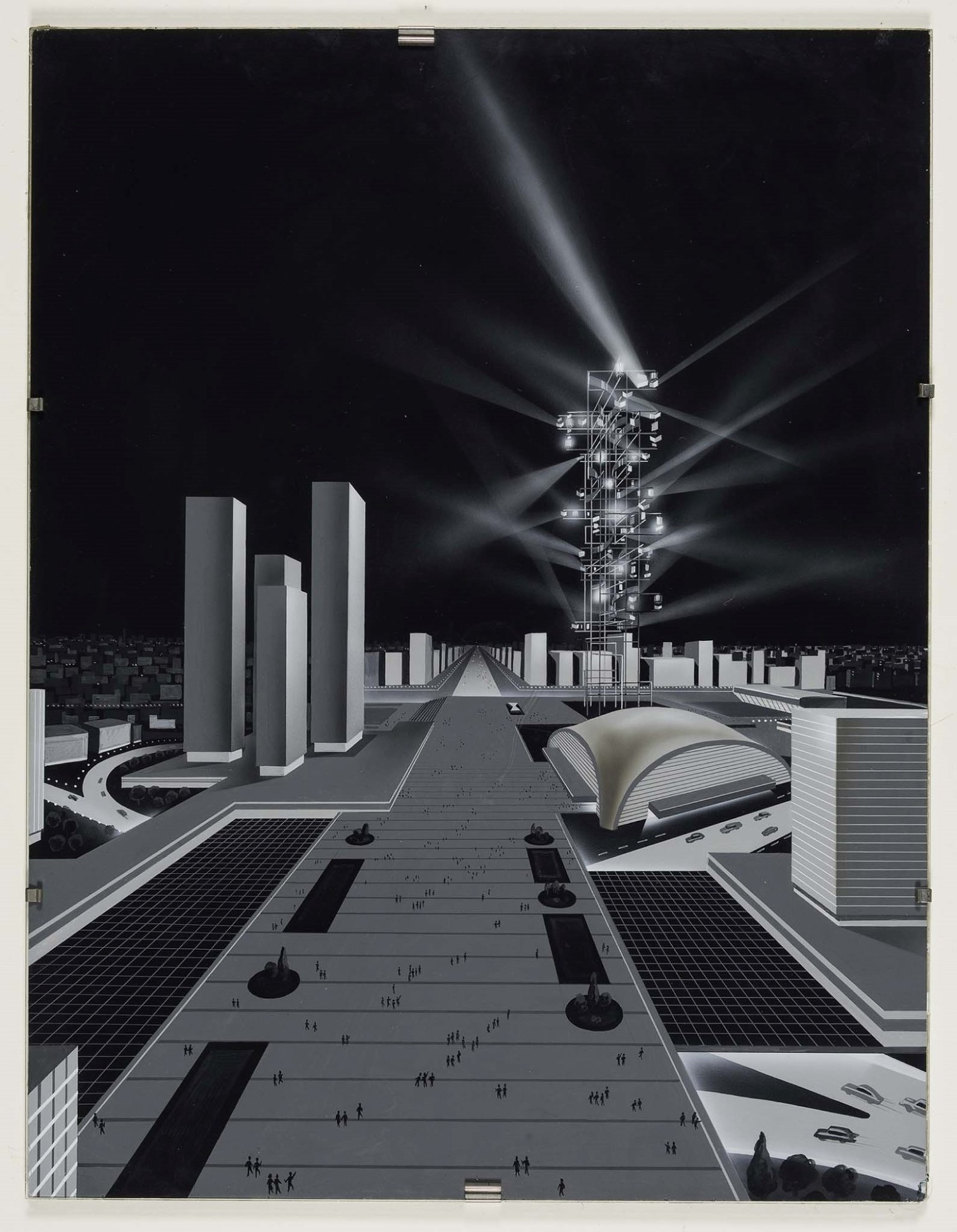Nicolas Schöffer. Tour Lumière Cybernétique de Paris-La Défense en situation, illuminée, vers 1970 - © N.Dewitte/LaM Adagp, Paris - Éléonore de Lavandeyra-Schöffer, 2018.