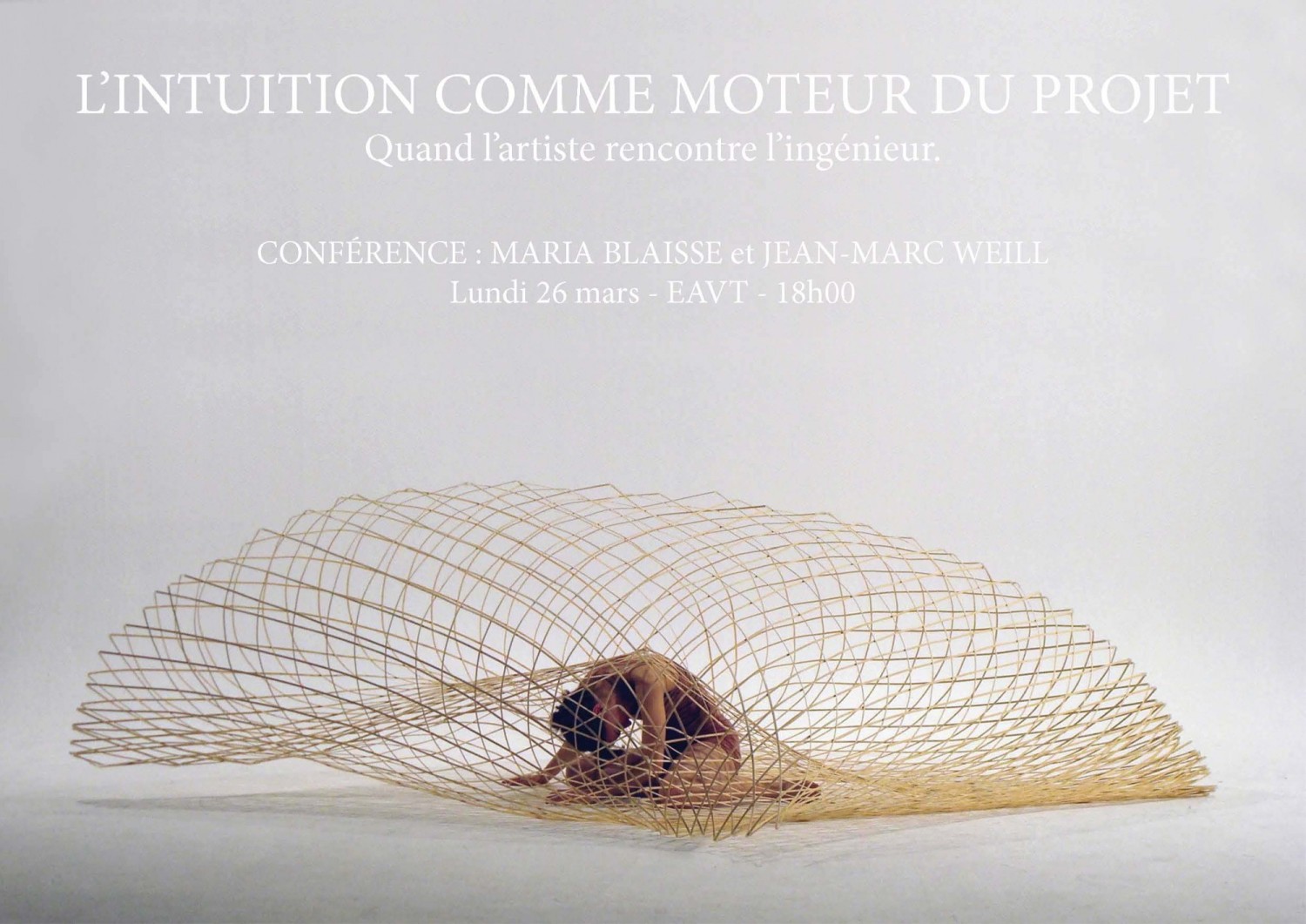 Conférence mixte de Maria Blaisse, artiste néerlandaise, et Jean-Marc Weill, architecte ingénieur, par ailleurs enseignant à l’Éav&t, qui tenteront d'illustrer de quelle manière l’artiste et l’ingénieur se retrouvent autour du projet pour au final parler d'architecture.