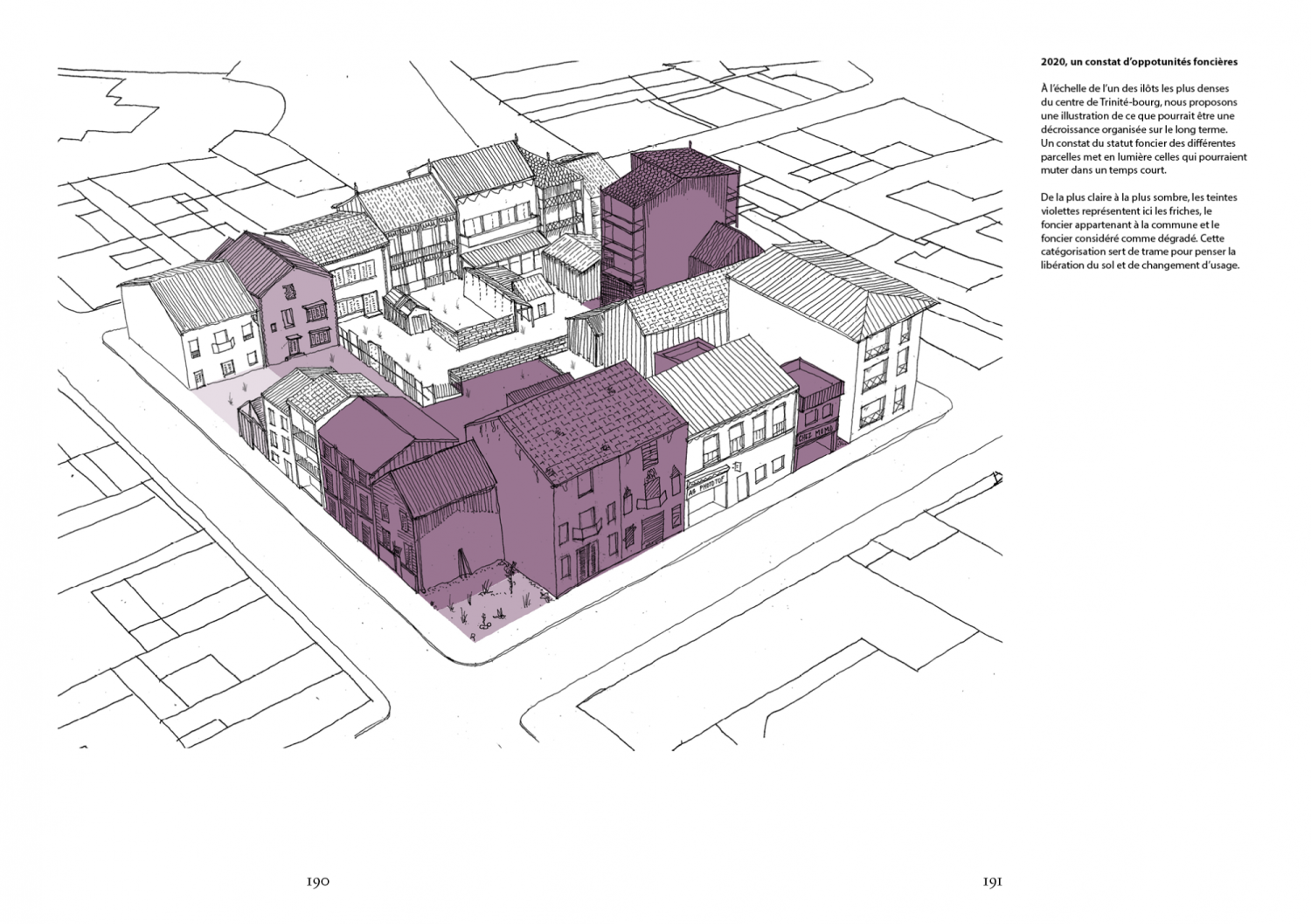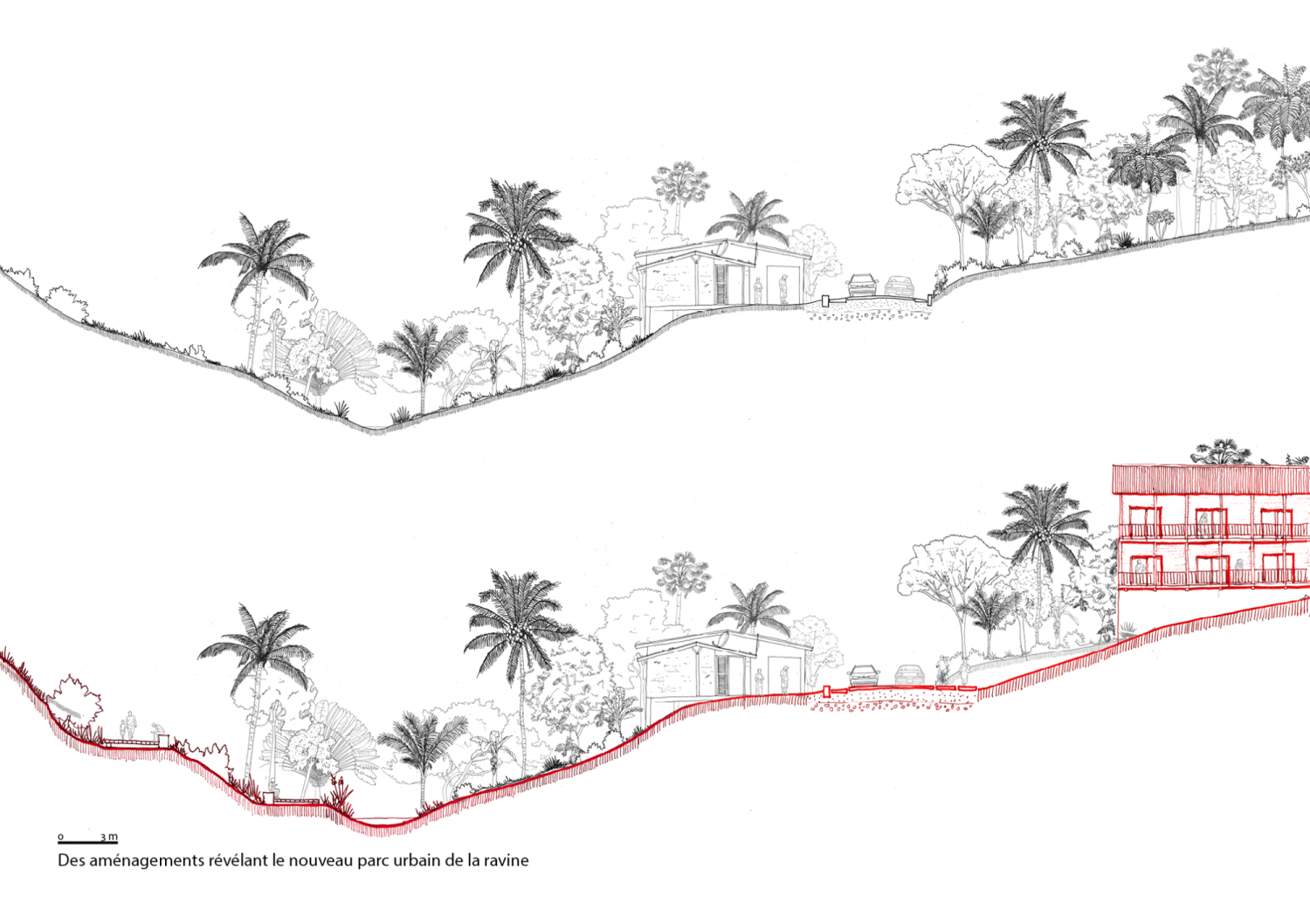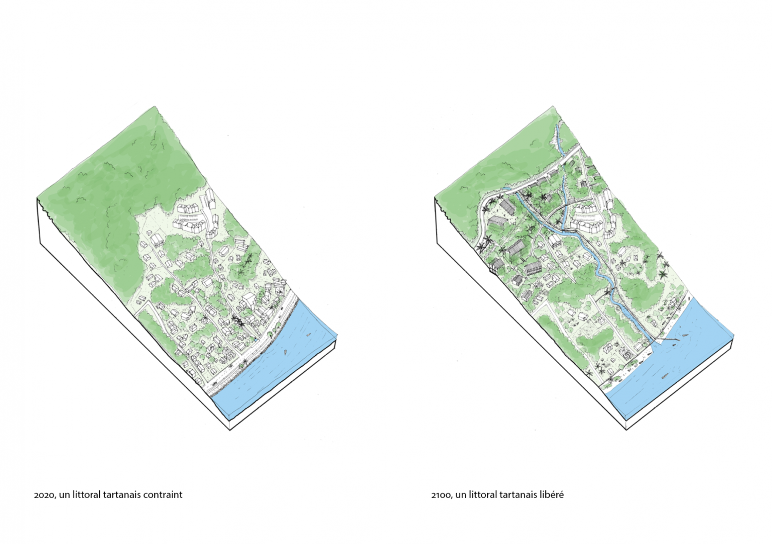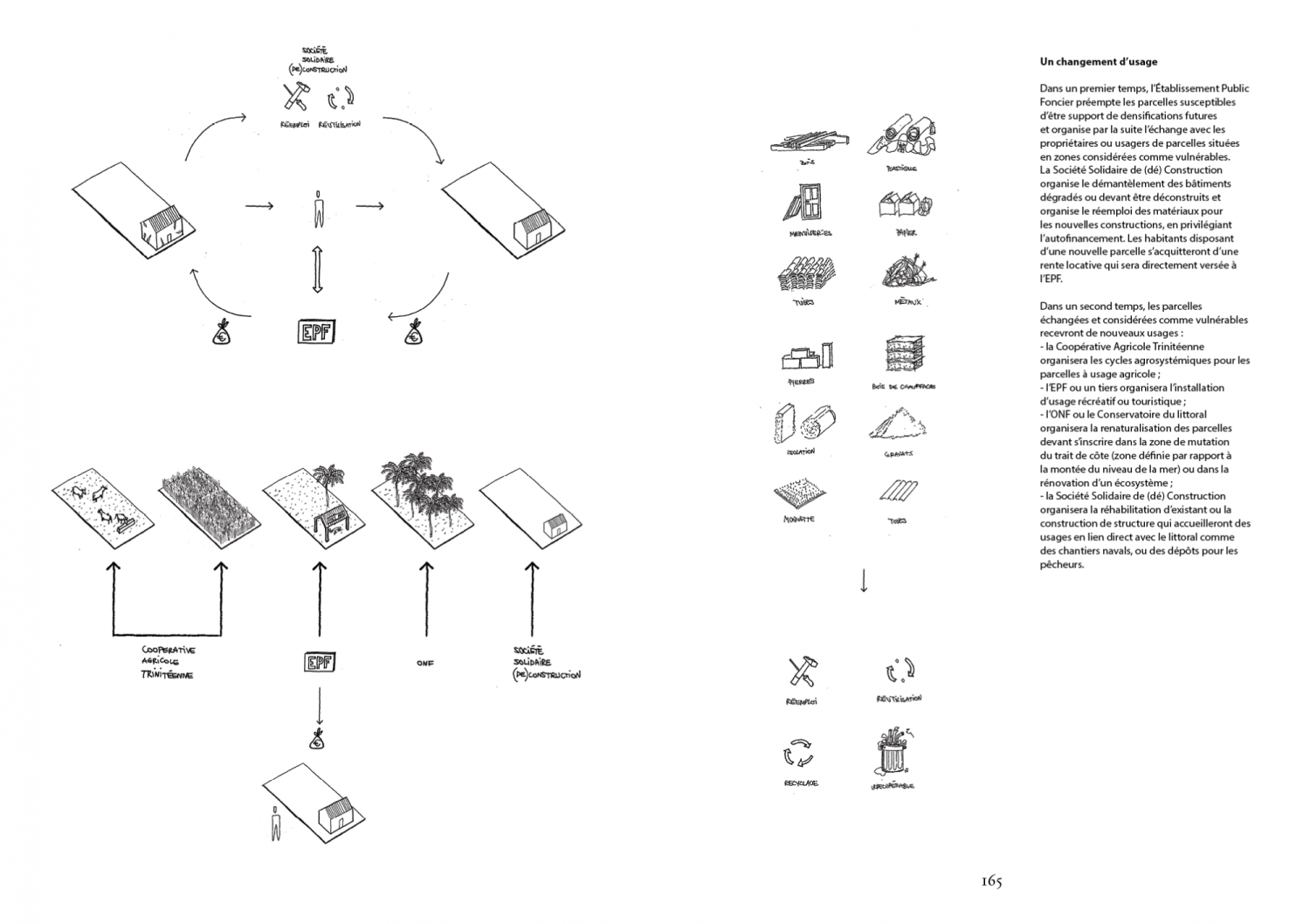 La commune de Trinité est marquée par l’omniprésence de la nature : plages, mornes boisés et mangroves. Dans cet environnement s’insère une structure urbaine organisée par secteurs : ville institutionnelle, bourgs de pêche, zone d’activité, résidences touristiques. Nous voyons là une ville-parc au sein d’une mosaïque de paysages remarquables traversés par des routes panoramiques et des sentiers. Mais la richesse de cette nature est aussi d’une brutalité intense. Soumise aux intempéries propres aux climats subtropicaux, la commune de Trinité doit pouvoir adapter sa forme urbaine à ces contraintes. De plus, les fronts de mer perturbent les équilibres majeurs des milieux côtiers en bloquant leurs mouvements. Cette étude envisage donc de restituer une épaisseur littorale naturelle, d’amorcer une dédensification progressive, dans une perspective de retour à un état plus naturel sous forme d’un sentier littoral actif.