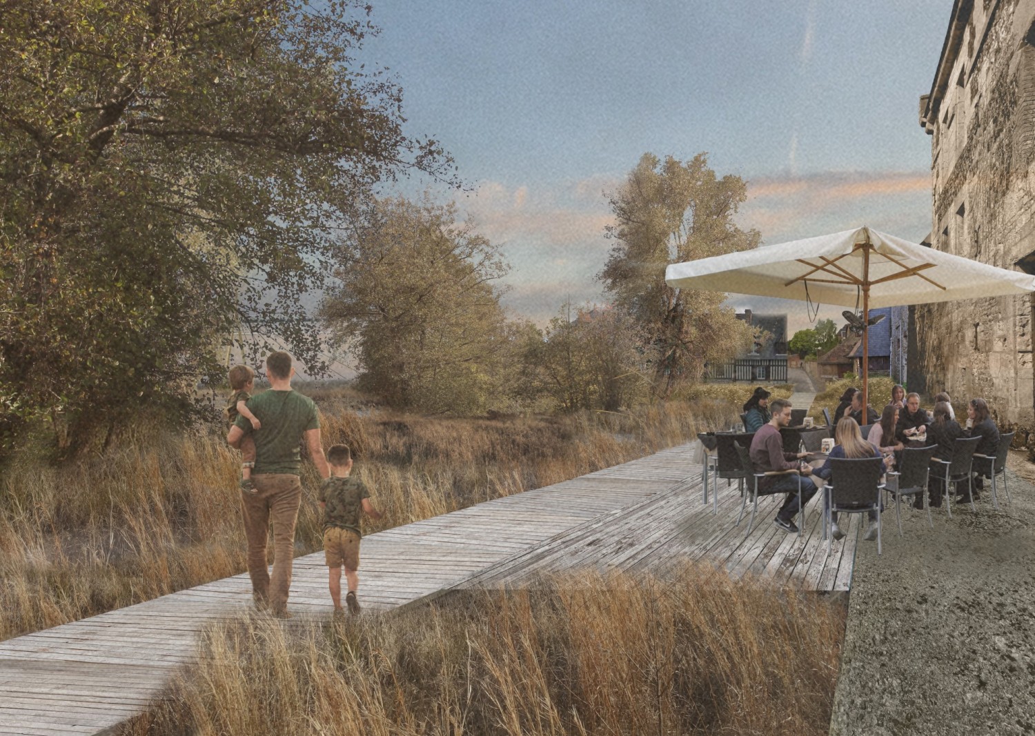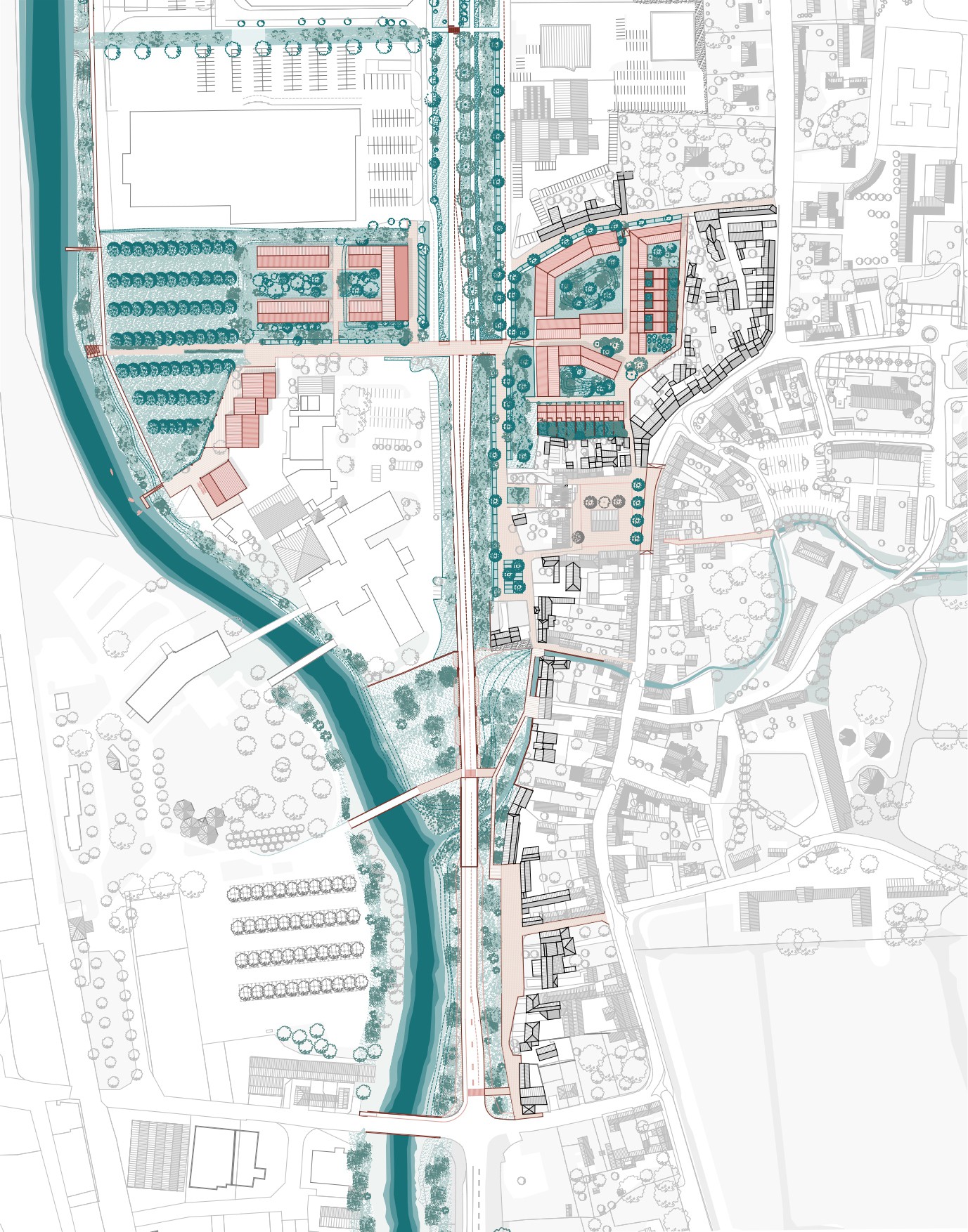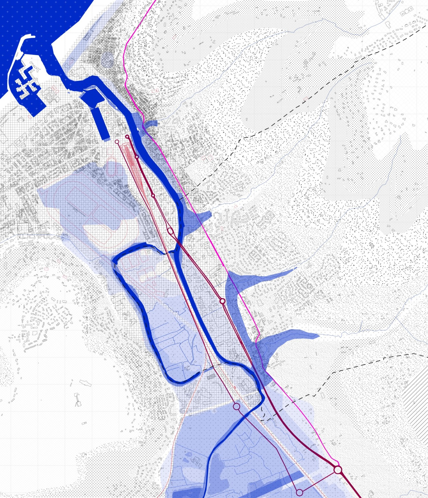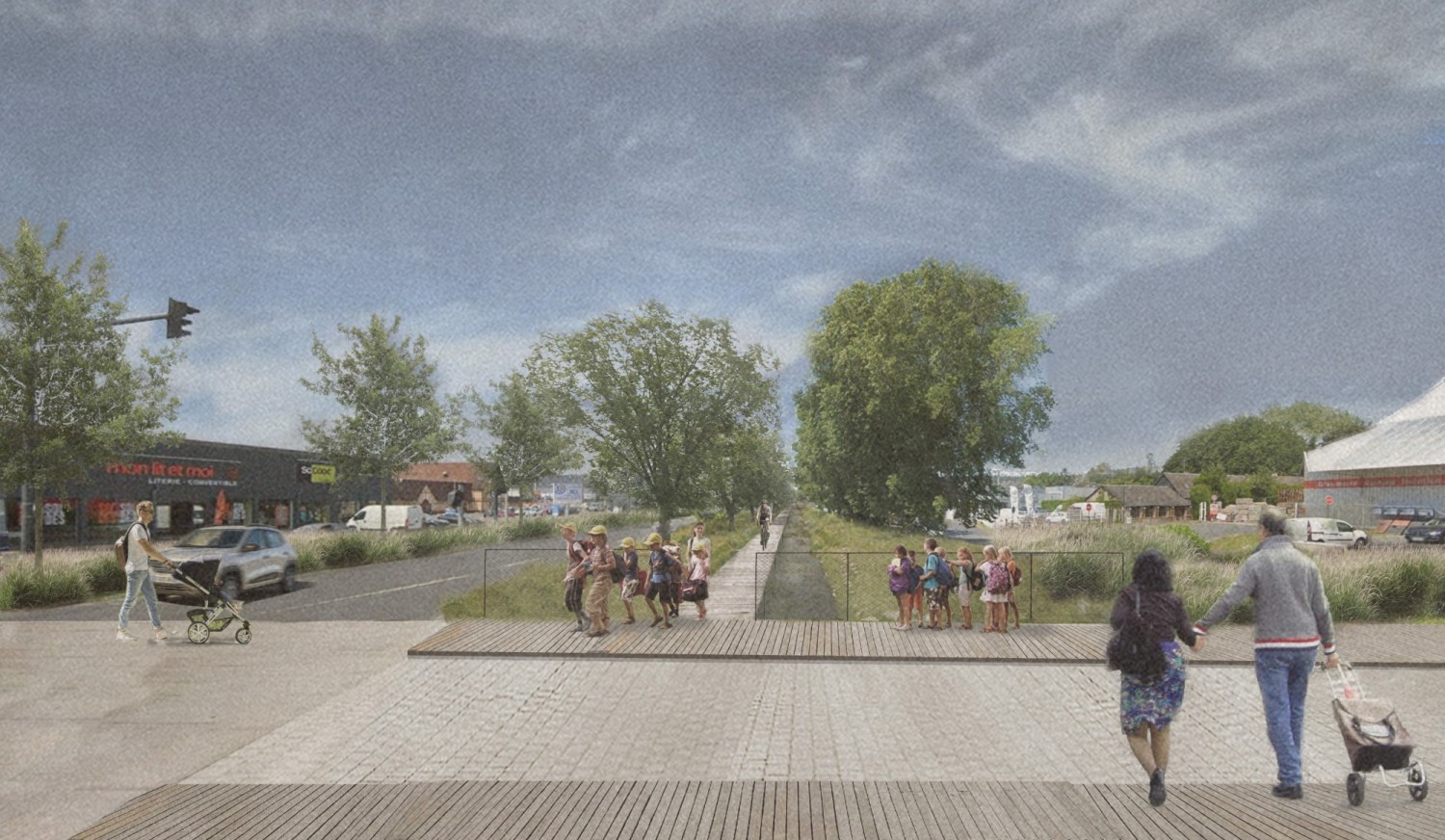 Mandatée par la ville de Touques et la Direction départementale des territoires et de la mer du Calvados (DDTM 14), l’étude interroge la place de la commune de Touques au sein de sa vallée, reléguée aujourd’hui à l’arrière-plan des stations balnéaires de Trouville et de Deauville et scindée par un sillon d’infrastructures dont elle est support. Accolée à une route départementale qui sépare la ville de son fleuve, une zone d’activités économiques compose aussi Touques, la plus affluente de la communauté de communes, implantée sur d’anciens marais. Comment restituer de la visibilité au centre-bourg médiéval de cette ville ? Comment accompagner la mutation de la zone d’activités économiques ? Comment penser une nouvelle offre de logements qui s’adapte au risque d’inondations ? L’étude propose ainsi de repenser notre mode d’habiter en zone inondable avec une gestion de l’eau intégrée à chaque temps du projet. En cherchant d’une nouvelle transparence hydraulique, Touques renoue avec son histoire. Reliant le centre ancien aux berges de la Touques, une traversée accompagne la mutation de l’espace public qu’elle rencontre. Considérant le risque inondation auquel la commune est soumise, l’étude propose d’adapter l’espace public à l’accueil de l’eau, suivant une logique de gestion hydraulique à l’échelle de la vallée. Aussi, le dessin de l’espace public accompagne l’émergence d’une nouvelle identité urbaine, ancrée dans le paysage de la vallée.