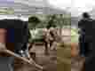 Afin de pouvoir construire la fontaine, il a tout d’abord été nécessaire d’excaver une partie de la terre afin de pouvoir construire les fondations et soubassement sur une dalle présente quelques dizaines de centimètres plus bas. Par ailleurs, nous avons construit le coffrage de la partie en pisé en amont afin de gagner du temps sur place. Enfin, nous avons apporté sur chantier l’ancienne fontaine afin de recycler la terre de celle-ci et avons effectué quelques tests sur différentes terres apportées par les encadrants afin de présenter nos essais et conclusions au public les jours suivants.