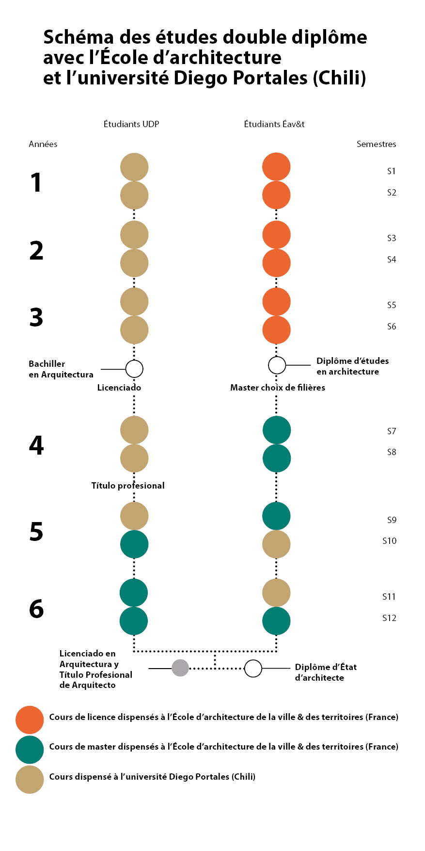 Ce double diplôme se déroule sur six semestres. Les candidat(e)s retenu(e)s par l'École effectuent les trois premiers semestres en France puis les deux suivants au Chili où ils passent le diplôme chilien. Ils reviennent pour un dernier semestre à l'École, en vu de l'obtention du diplôme d'État d'architecte.