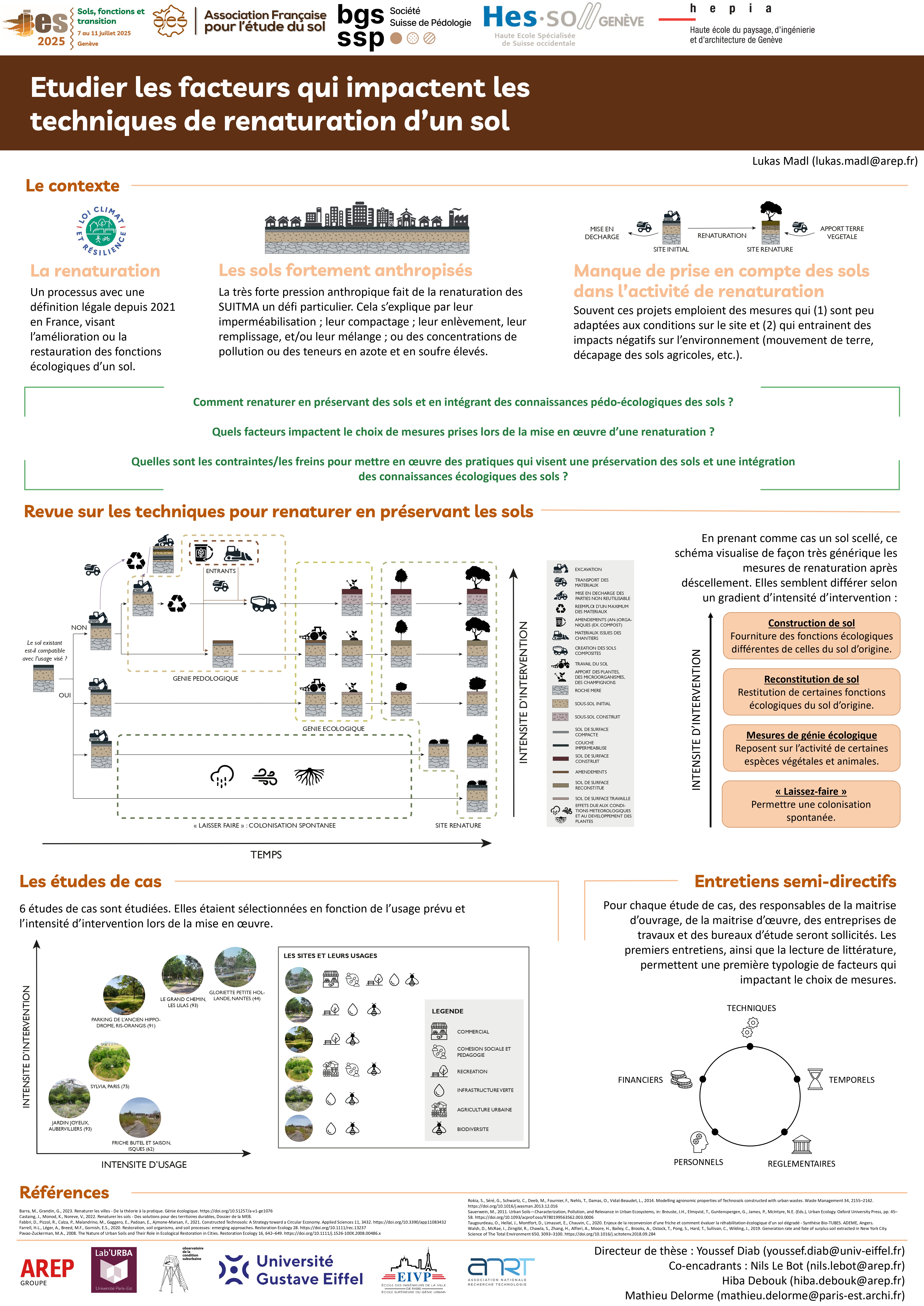 Dans la démarche de répondre à la dégradation des écosystèmes, la renaturation est un terme dont son utilisation augmente de manière inflationnaire. Sa définition restant floue, elle semble incarner une large gamme d’opérations d’aménagement urbaine visant à la création des espaces verts en ville. On constate un changement de paradigme dans la mise en œuvre de ces projets, qui accorde davantage d'importance aux sols et à leurs fonctions écologiques dans la conception des projets. Cette évolution s'accompagne d'une augmentation du nombre d'études axées sur l'intégration des connaissances pédologiques dans les projets de renaturation (Blanchart et al., 2018; Deboeuf de Los Rios et al., 2022 ; Monfort et al., 2019; Schwartz et al., 2024, 2022; Taugourdeau et al., 2020). Néanmoins, les travaux scientifiques qui traitent au niveau opérationnel de l'adaptation des méthodes et techniques de renaturation aux conditions locales sont rares.