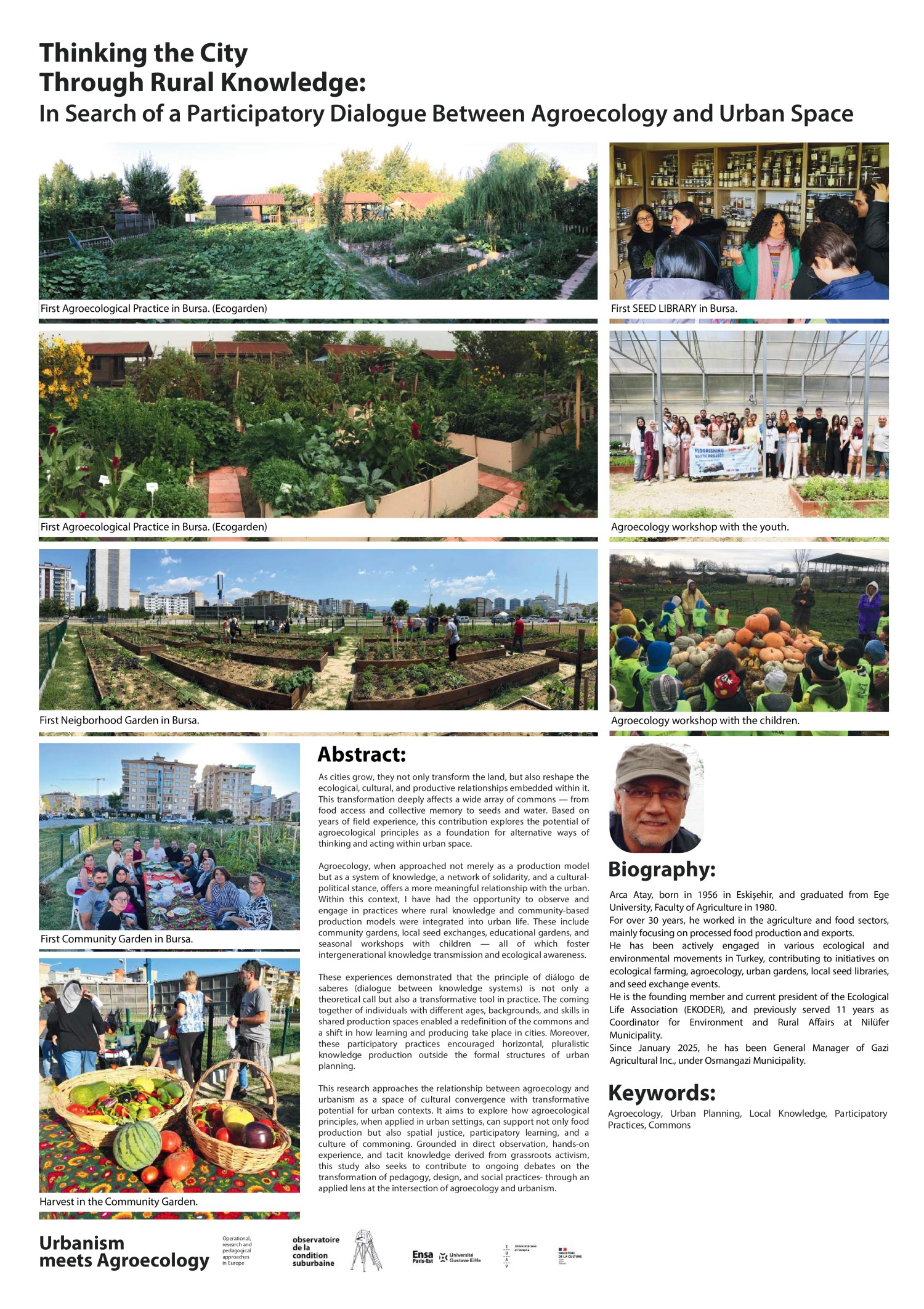 Arca Atay, born in 1956 in Eskişehir, and graduated from Ege University, Faculty of Agriculture in 1980. For over 30 years, he worked in the agriculture and food sectors, mainly focusing on processed food prduction and exports. He has been actively engaged in various ecological and environmental movements in Turkey, contributing to initiatives on ecological farming, agroecology, urban gardens, local seed libraries, and seed exchange events. He is the founding member and current president of the Ecological Life Association (EKODER), and reviously served 11 years as Coordinator for Environment and Rural Affairs at Nilüfer Municipality. Since January 2025, he has been General Manager of Gazi Agricultural Inc., under Osmangazi Municipality.