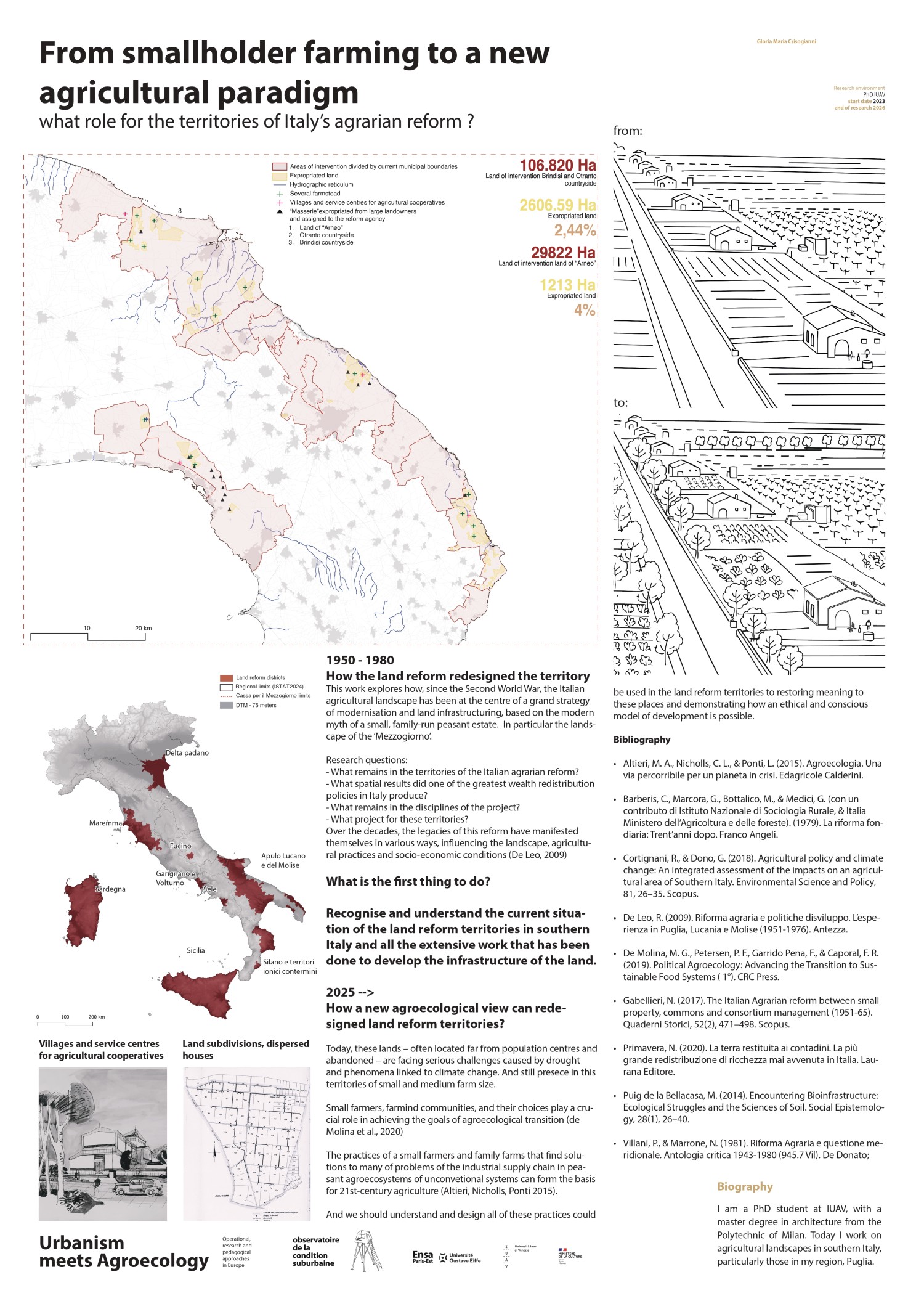 This doctoral research investigates the legacy of agrarian reform through the urban and territorial analysis of two emblematic regions in Southern Italy—Capitanata and Salento—with the aim of reconstructing their transformation trajectories, current challenges, and the spatial outcomes produced by one of the most extensive wealth redistribution policies in the history of republican Italy (Primavera, 2020; De Leo, 2009).