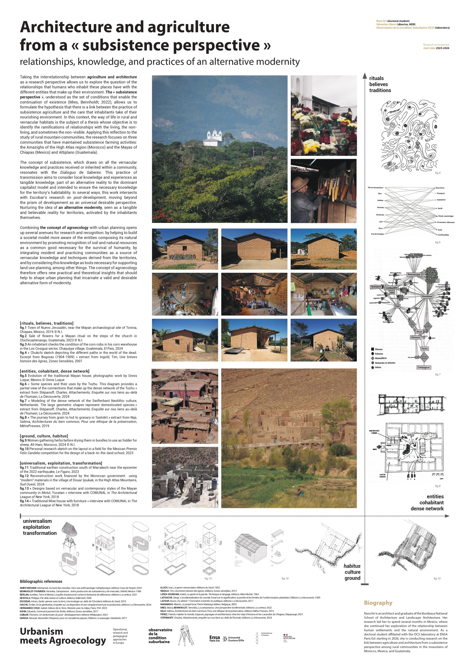 Nora Itri is an HMONP architect and graduate of the Bordeaux National School of Architecture and Landscape Architecture. Her research led her to spend several months in Mexico, where she continued her exploration of the relationship between human settlements and the natural environment. As a doctoral student attached to the OCS laboratory at ENSA Paris-Est from 2026, she is undertaking research on the link between agriculture and architecture from a subsistence perspective among rural communities in the mountains of Morocco, Mexico, and Guatemala.