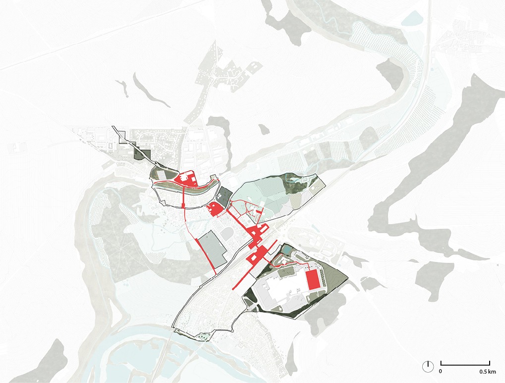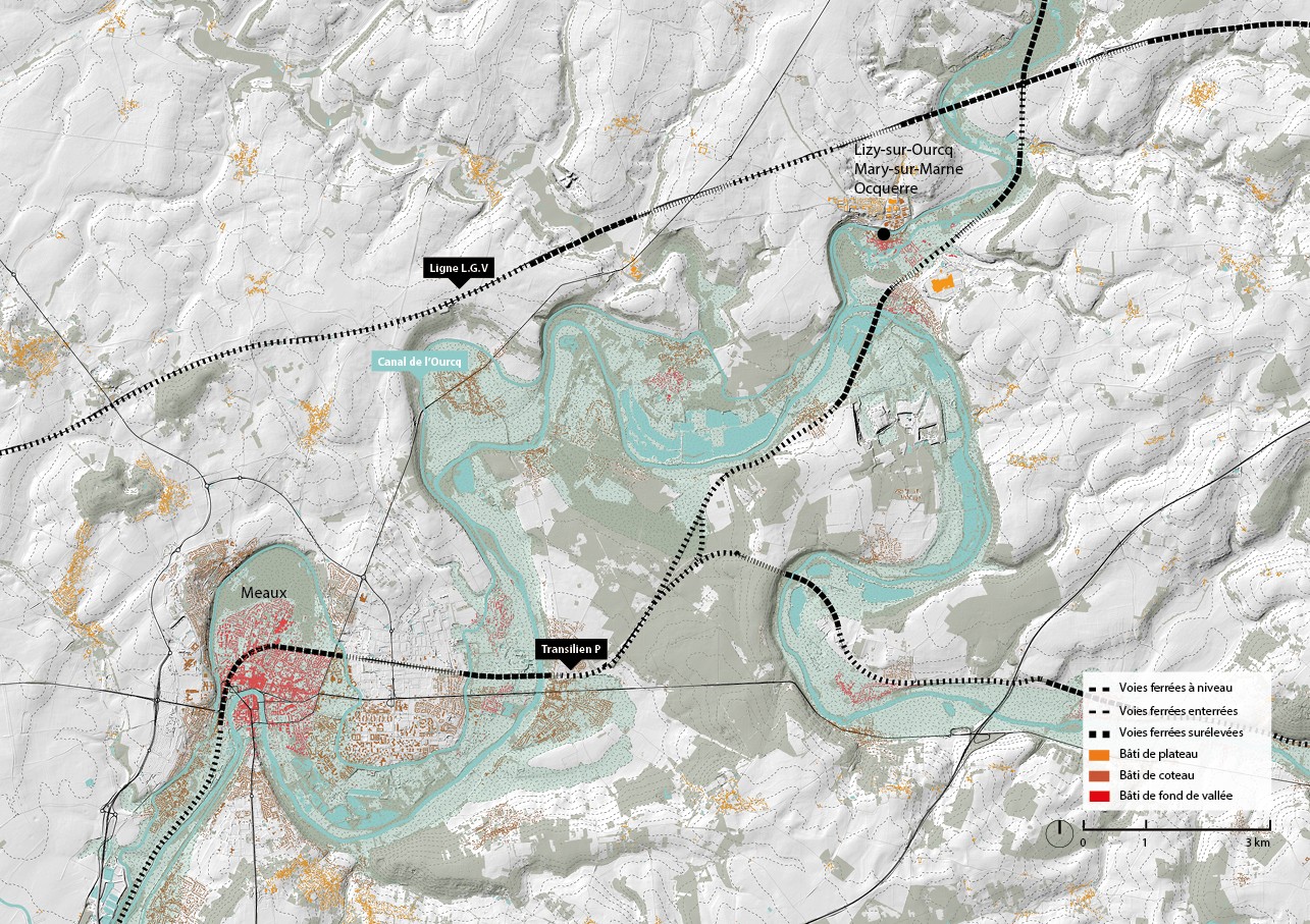 Quiconque traverse Lizy-sur-Ourcq, Mary-sur-Marne ou Ocquerre ne peut échapper au dialogue entre la vallée de l’Ourcq et la pyramide de l’imprimerie Didier Mary. Cette figure rappelle la période prospère des années 1990, loin de la situation actuelle des trois communes. Les symptômes de ce territoire aujourd’hui fragilisé sont connus : dévitalisation du centre-ville, paupérisation, chômage, perte d’emplois et d’attractivité économique. Au travers de cette étude, la Direction départementale de Seine-et-Marne prend en main le développement du territoire de l’intercommunalité, accompagné par la communauté de communes du Pays de l’Ourcq. L’objet de la commande souhaite retrouver la cohérence d’un territoire « péri-métropolitain », chahuté entre les logiques locales et celles du Grand Paris. Le rayonnement intercommunal prend son point de départ autour de la gare, à la croisée de toutes ces échelles territoriales. Comment un travail sur les accès et la cohabitation des modes de déplacement pourrait-il devenir vecteur d’une nouvelle cohérence territoriale depuis la gare ? Appréhender ce projet urbain à travers une complémentarité des circuits, équipements et paysages du quotidien permettrait-il de retrouver proximités et continuités dans la pratique locale du Pays de l’Ourcq ? En suivant le principe de ne pas « séparer la ville des lieux de celles des liens », six situations de projet tendent vers cet équilibre : resserrer les « liens » tout en renforçant les « lieux ». Redéfinir l’identité du lieu de la mobilité (la gare), tisser une continuité urbaine et paysagère (l’îlot « interface »), connecter et protéger l’économie locale (le site de l’imprimerie), retrouver le paysage de la vallée de l’Ourcq (la promenade du Plateau), dynamiser le centre-ville (fusion d’écoles et équipement culturel) : tels sont les objectifs pour favoriser les pratiques quotidiennes de ce territoire diffus.