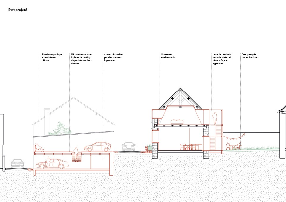 Notre travail se concentre d’abord sur trois villages sélectionnés comme étant représentatifs de la structure paysagère et des enjeux économiques et sociaux du plateau mantois. Ces villages font ensuite l’objet de projets s’emparant des questions que posent la transformation d’un tel territoire : la densification de l’existant, la réhabilitation de corps de fermes, le stationnement, les espaces publics en milieu pavillonnaire, etc. De ces projets nous tirons des principes généraux qui proposent des orientations d’aménagement thématiques, comme autant d’aides à l’écriture d’une règle alors générée par le projet. Ces interventions sont enfin l’occasion de proposer une méthode d’inventaire du patrimoine qui fait du potentiel de transformation un prisme de sélection des objets méritant d’être intégrés à l’inventaire.