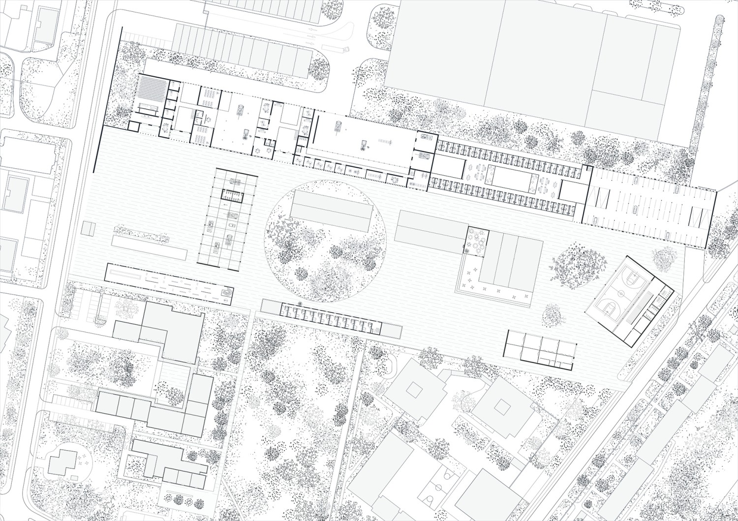 Si Satory Ouest se prépare à l’arrivée du Grand Paris Express, Satory Est reste un camp militaire de première importance. Paysage de pouvoir façonné en contrepoint du château de Versailles, il abrite des bureaux stratégiques, des équipements industriels et des quartiers résidentiels sur un plateau délimité par des infrastructures végétales et ferroviaires. Le métro vient bouleverser l’équilibre de cet îlot discret et pousse l’armée à repenser son occupation des lieux. En dessinant finement les limites de chaque domaine, l’étude s’attache à réinterroger la frontière en tant qu’interface habitée.