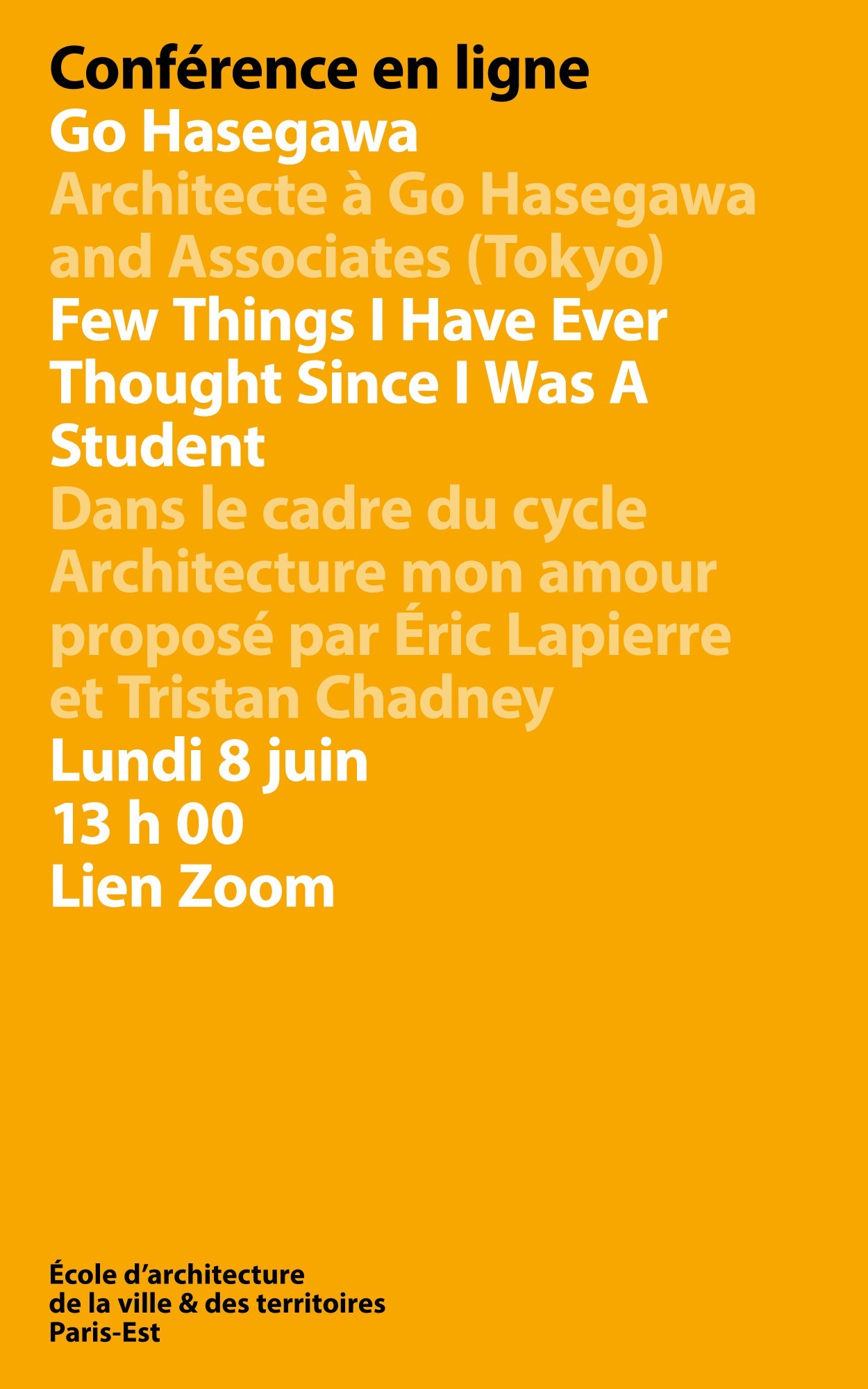Dans le cadre du cycle de conférences Architecture mon amour, l'architecte japonais Go Hasegawa nous donne une conférence exceptionnelle intitulée "Few Things I Have Ever Thought Since I Was A Student".