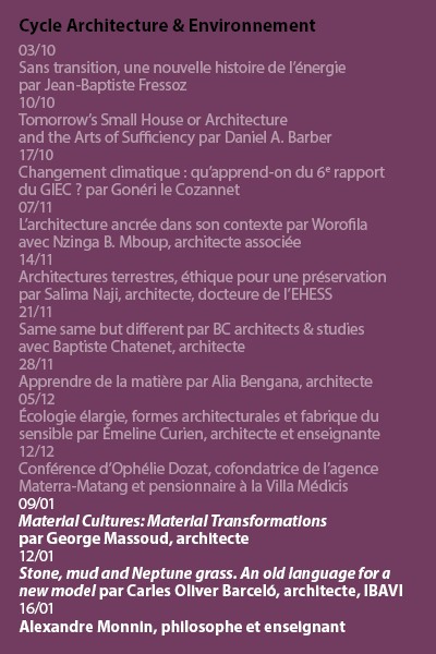 Pour réfléchir à ces évolutions, la commission Environnement et pédagogie de l’École d’architecture de la ville & des territoires Paris-Est invite dix conférenciers et conférencières à partager leurs expériences sur ce sujet. Des climatologues du GIEC et des historiens de l’environnement nous rappellerons d’abord la trajectoire qui nous a menés dans cette situation, aussi bien que les différents scénarios qui se dessinent pour notre futur. Les autres intervenants s’attèlent plus directement à repenser la pratique de l’architecture à l’aune des bouleversements environnementaux. Exerçant à Londres ou à Dakar, dans des collectifs ou dans des laboratoires de recherche, toutes et tous inventent ou réinventent des manières de repenser l’architecture. Ils et elles développent des alternatives à la construction en béton et à la climatisation, adaptent des matériaux naturels aux modes de production industriels, ou inventent des dispositifs pour réduire la dépendance des bâtiments aux énergies fossiles. Certains groupes repensent la manière de construire avec des ressources locales dans des territoires insulaires, d’autres redécouvrent les dispositifs de l’architecture vernaculaire en climat chaud, quand d’autres enfin font de la réutilisation du bâti existant la matière d’une nouvelle théorie de l’architecture.