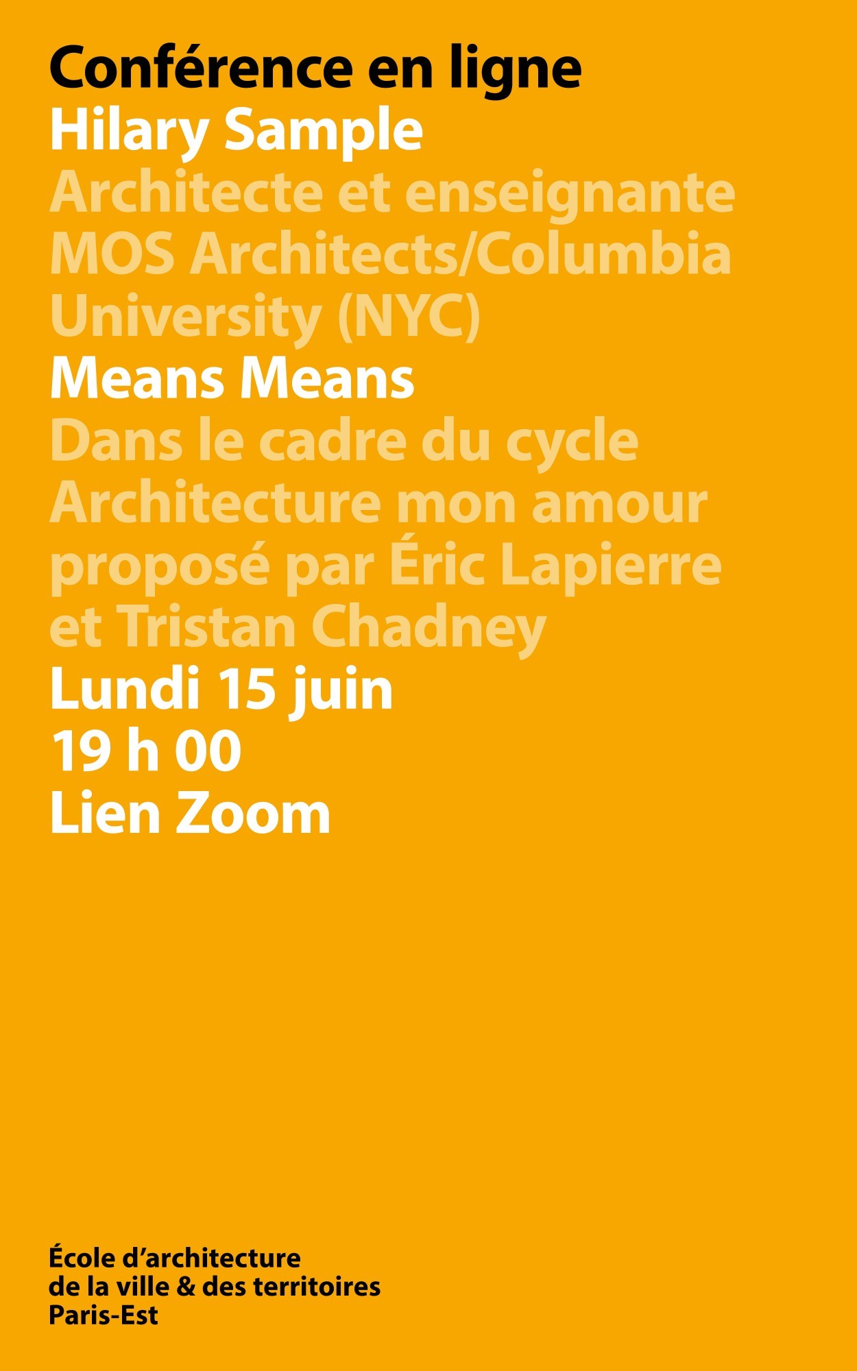 Dans le cadre du cycle de conférences Architecture mon amour, l'architecte américaine Hilary Sample nous donne une conférence exceptionnelle intitulée "Means Means".