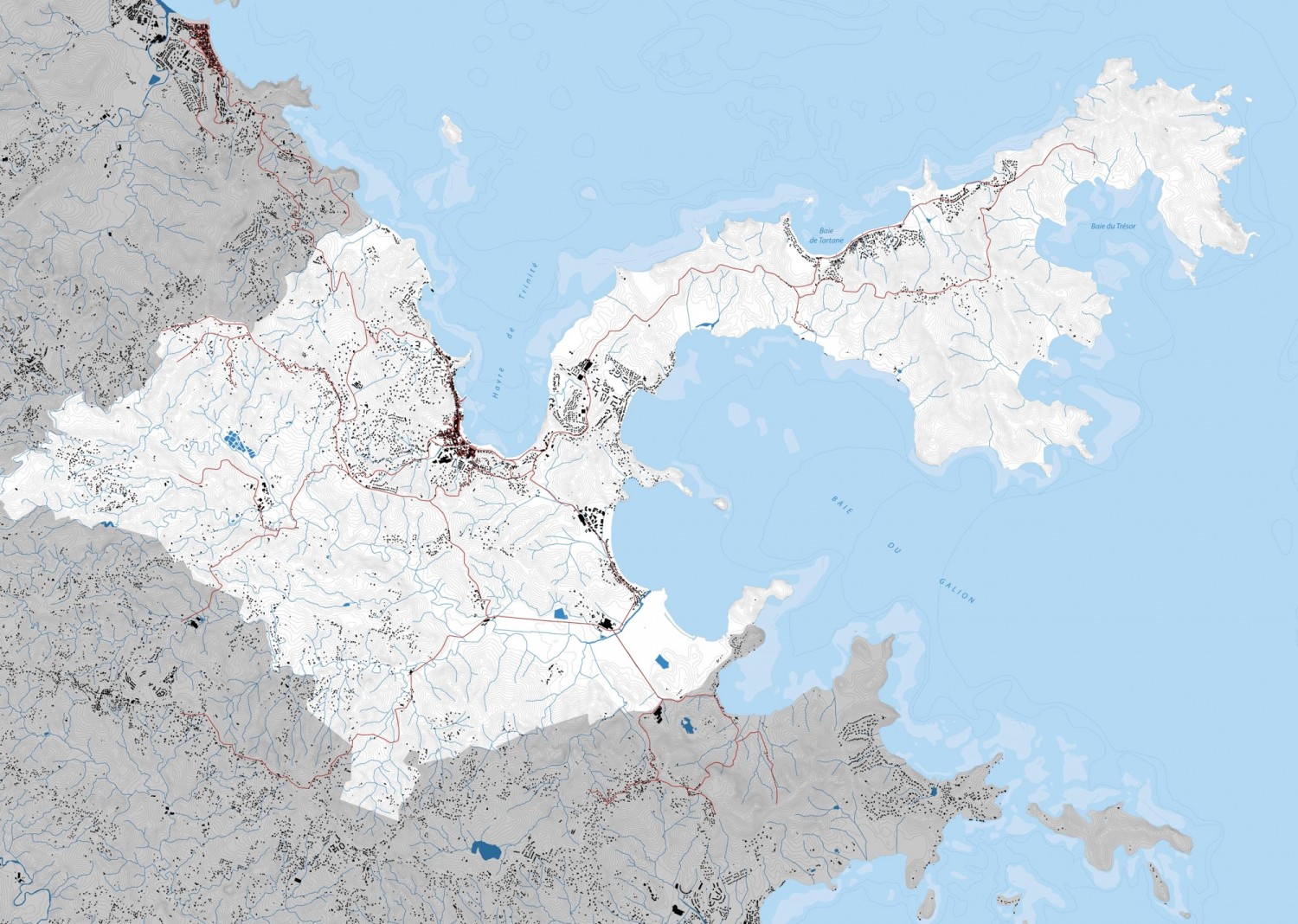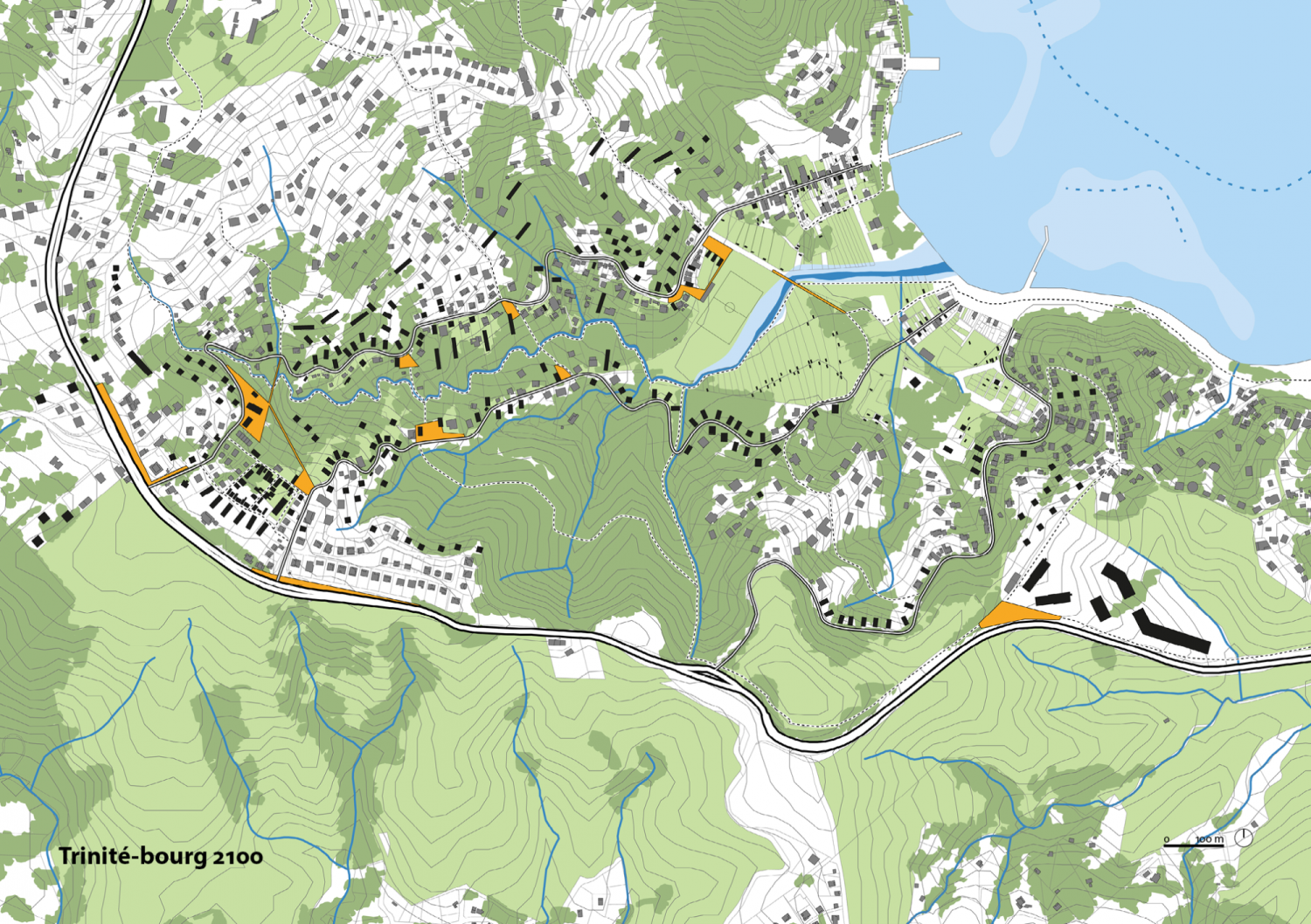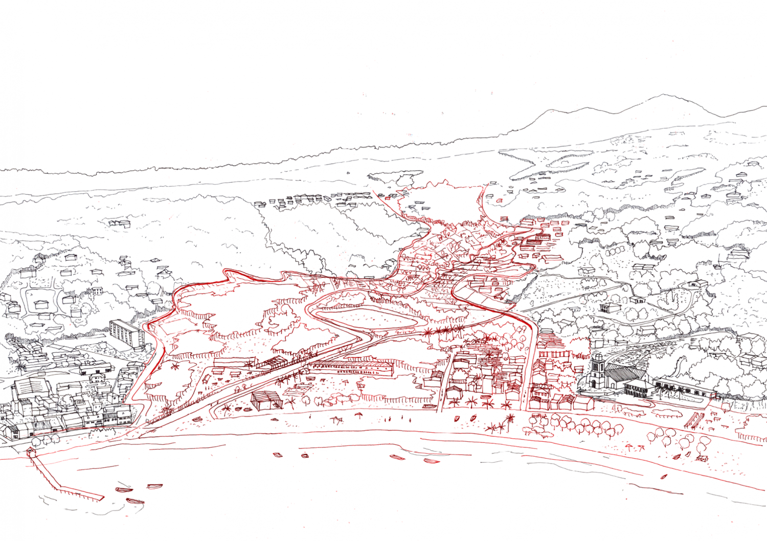 La commune de Trinité est marquée par l’omniprésence de la nature : plages, mornes boisés et mangroves. Dans cet environnement s’insère une structure urbaine organisée par secteurs : ville institutionnelle, bourgs de pêche, zone d’activité, résidences touristiques. Nous voyons là une ville-parc au sein d’une mosaïque de paysages remarquables traversés par des routes panoramiques et des sentiers. Mais la richesse de cette nature est aussi d’une brutalité intense. Soumise aux intempéries propres aux climats subtropicaux, la commune de Trinité doit pouvoir adapter sa forme urbaine à ces contraintes. De plus, les fronts de mer perturbent les équilibres majeurs des milieux côtiers en bloquant leurs mouvements. Cette étude envisage donc de restituer une épaisseur littorale naturelle, d’amorcer une dédensification progressive, dans une perspective de retour à un état plus naturel sous forme d’un sentier littoral actif.