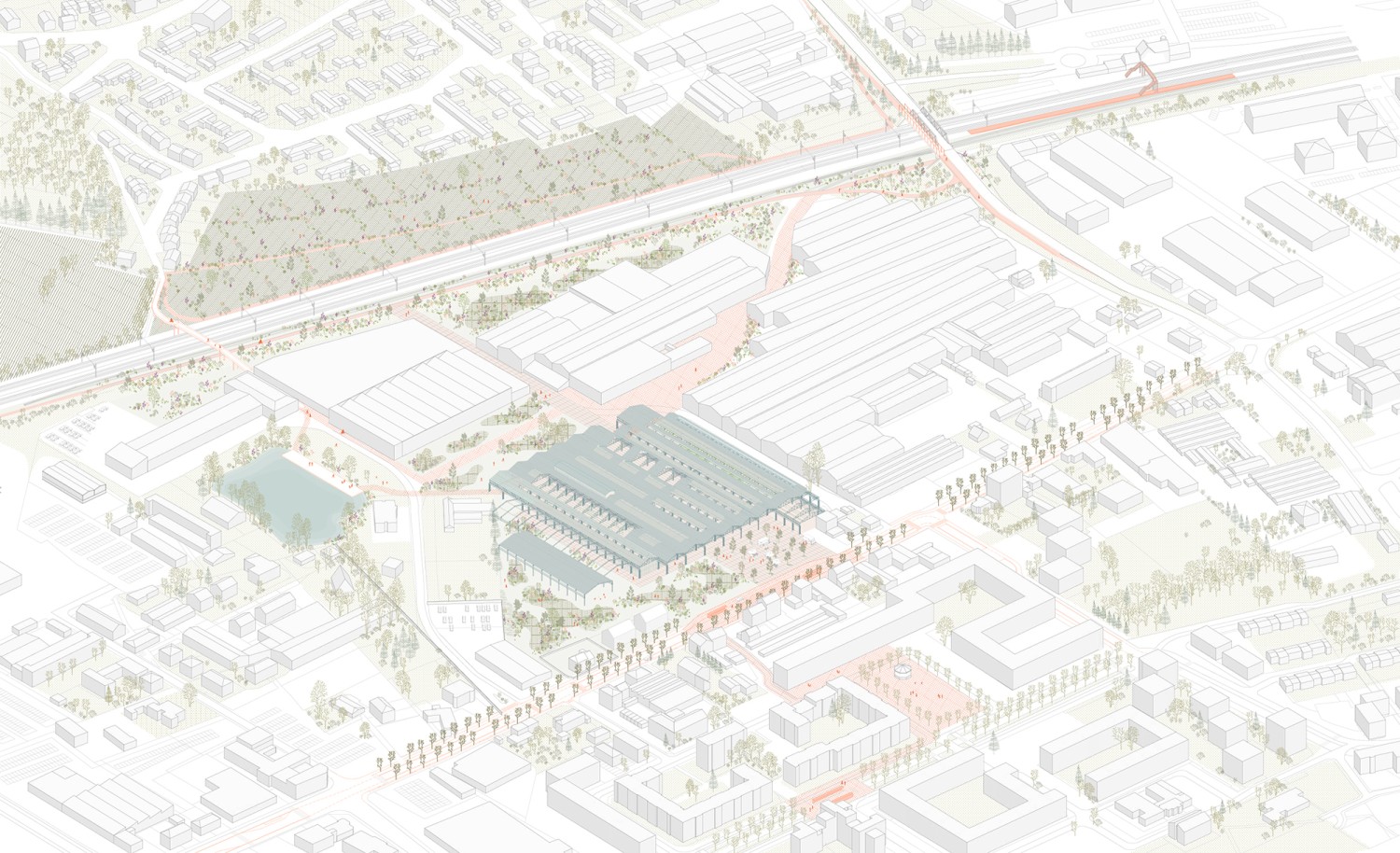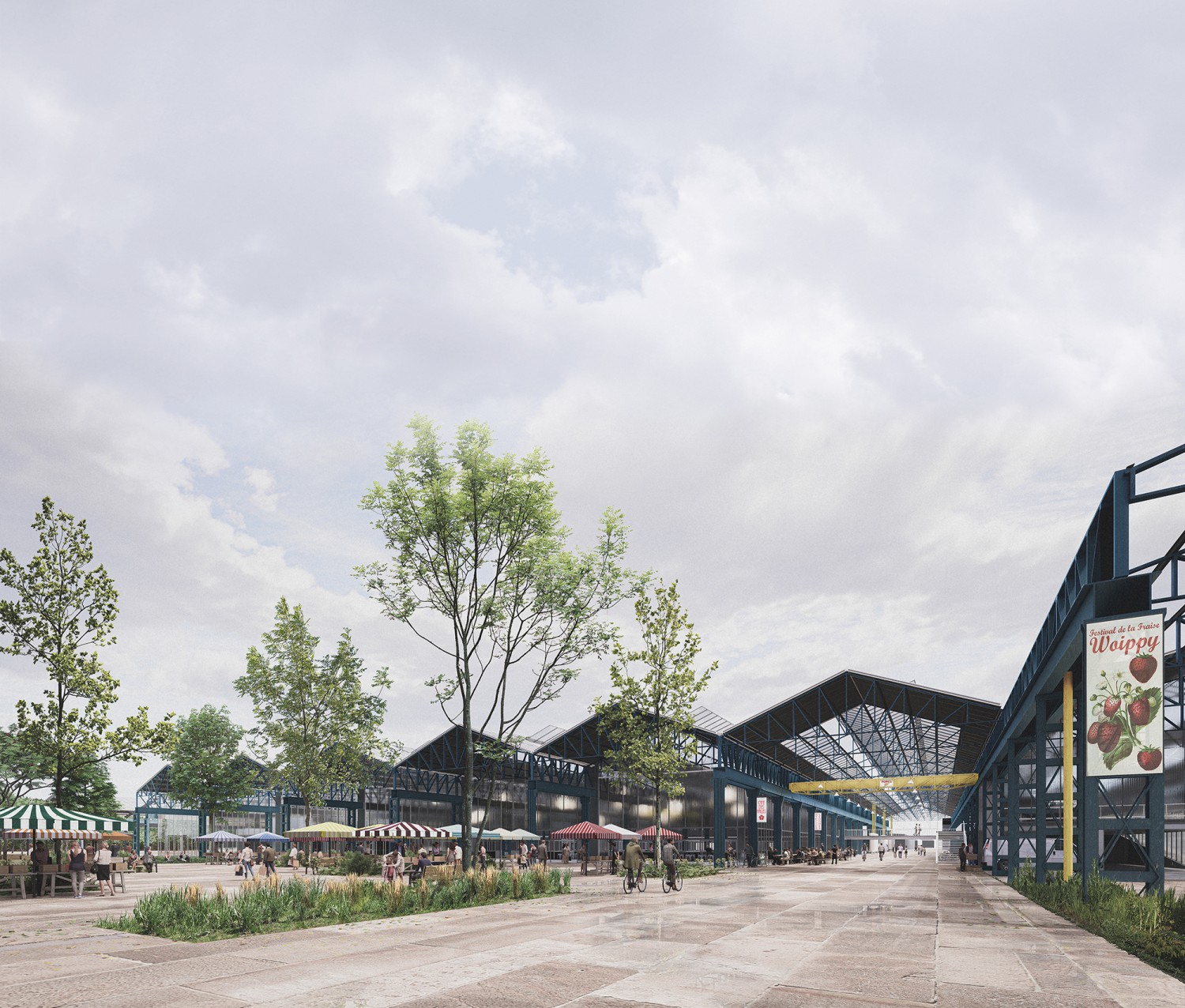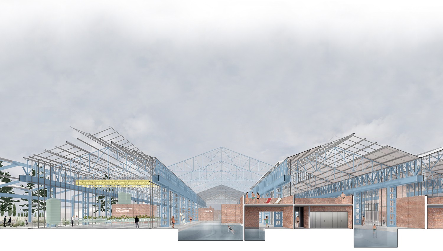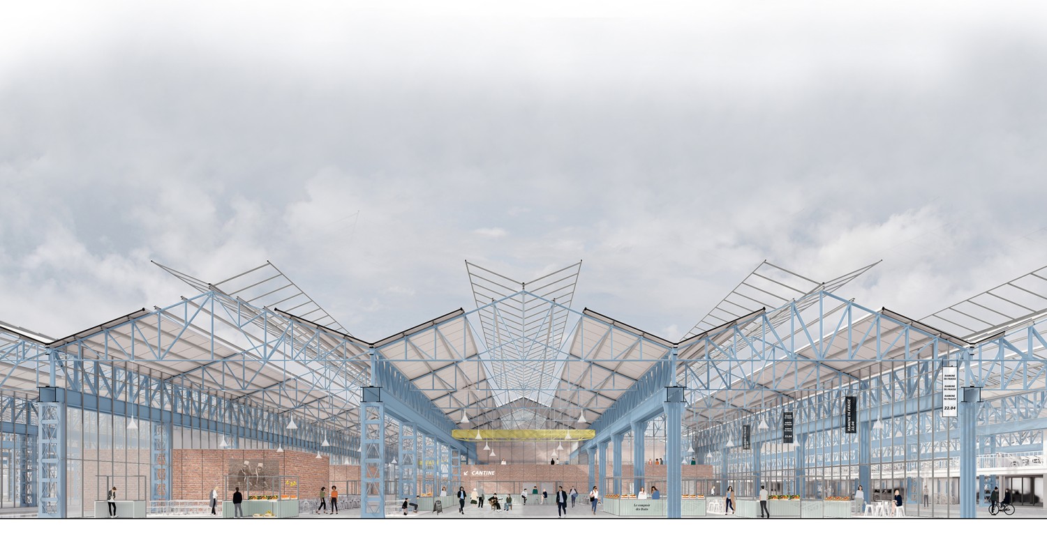 Cette étude porte sur le projet de réhabilitation de halles industrielles situées à Woippy, en Moselle. Abandonnées depuis plus de vingt ans, ces halles font partie d’un riche patrimoine de friches industrielles qui témoignent de l’activité sidérurgique et métallurgique du bassin mosellan. À travers la conception d’un équipement métropolitain, alliant programmes alimentaires et de loisir et réinvestissant les structures industrielles existantes, cette étude explore trois enjeux contemporains : la revalorisation des friches, la question de l’alimentation et l’identité paysagère. Avec une approche qui navigue entre les échelles, ce projet propose de mettre les halles Sollac dans une perspective active de restructuration de la commune, en exploitant les potentiels de cette friche comme un levier pour une transition architecturale, urbaine et territoriale.