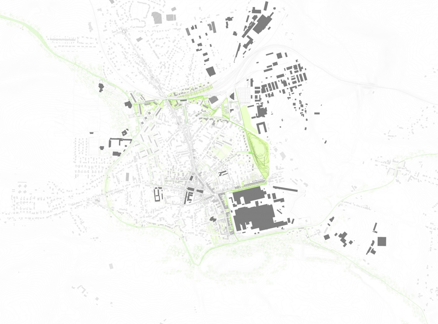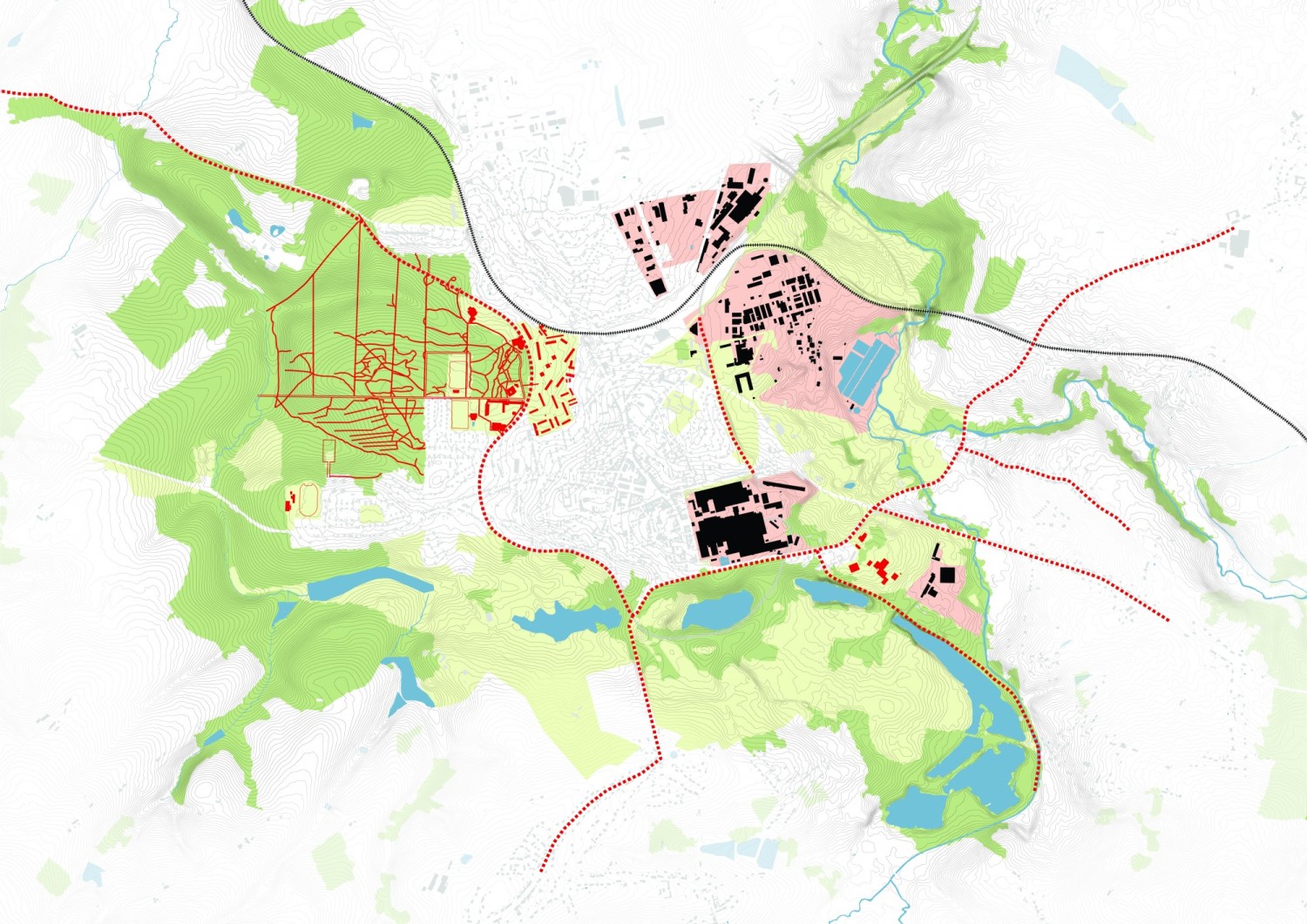 Situation exemplaire des villes françaises petites et moyennes, isolée par son positionnement géographique et confrontée au déclin progressif de son centre, la commune de Commentry, dans le département de l’Allier, peine à se détacher de son image de « ville minière » et à attirer les familles qui ne s’installent plus dans son bourg. Afin d’enrayer cette décroissance urbaine et la baisse continue de sa démographie, la commande a pour but de planifier la revitalisation de son centre-bourg. Dans cet objectif, le travail réalisé propose un élargissement du cadre d’étude, d’une part, et de considérer la déprise comme condition de projet, à même de pouvoir être le réceptacle de nouvelles qualités urbaines et d’un nouveau dynamisme pour la ville, d’autre part. L’étude envisage de resserrer les liens entre les différents quartiers disposés au sein d’un tissu résidentiel historiquement aggloméré aux usines, aujourd’hui encore en activité. En consolidant une structure urbaine à l’échelle territoriale, elle vise à renforcer la morphologie caractéristique de la ville, notamment issue de son patrimoine industriel, et à l’articuler autour de ses équipements et de problématiques urbaines locales. Le projet dessinant une offre alternative à l’habitat pavillonnaire, Commentry tend ainsi à retrouver et à valoriser ses qualités propres aujourd’hui oubliées par la réappropriation progressive du territoire rural et la réactualisation d’une manière d’habiter à la fois ancienne et très actuelle : à deux pas du bourg et aux portes de la campagne.