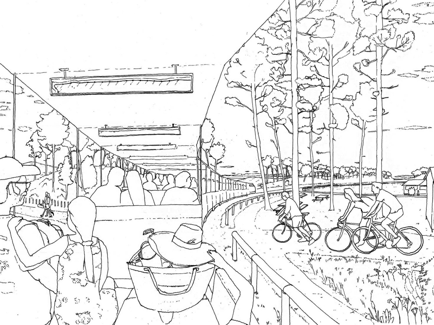 Enfin nous développons cinq projets pilotes qui visent à imaginer différentes manières d’habiter l’épaisseur retrouvée du littoral, entre les bourgs historiques, implantés sur la crête géologique, et la plage rendue à son état de nature.