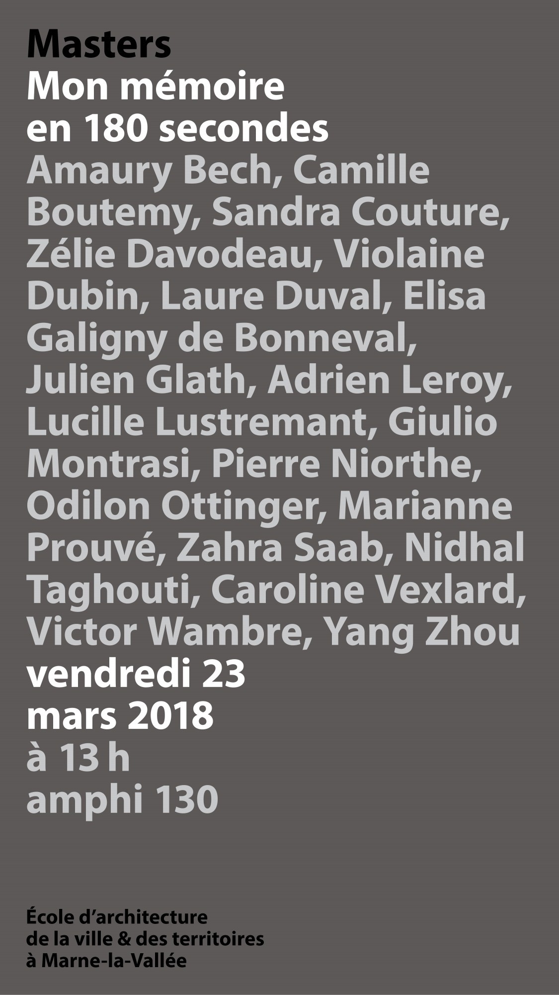 14 mémoires réalisés dans le cadre des 4 filières de 2e cycle seront présentés par les étudiants en 180 secondes, suivra un échange de 5 minutes – maximum - avec les enseignants présents pour explorer les éventuelles suites à donner pour poursuivre et valoriser ce travail de recherche :