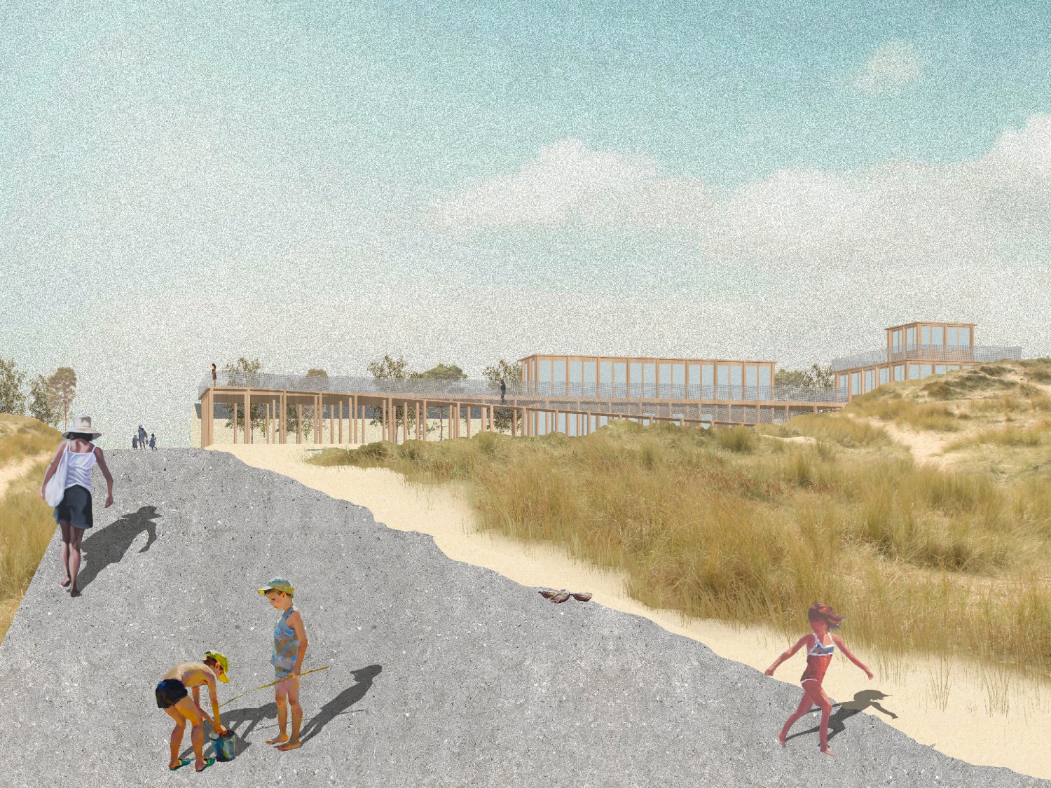Fondées durant la période médiévale, Gouville-sur-Mer et Blainville-sur-Mer s’implantent sur les hauteurs, la mer étant perçue comme un danger et une ressource. C’est ainsi que s’établissent transversalement les activités humaines. À l’après-guerre, ce rapport s’inverse : la dune est urbanisée au profit du tourisme et de la production. Aujourd’hui, l’accentuation de phénomènes naturels fait resurgir la conscience du risque, remettant en question la pérennité des installations du bord de mer. Les ajustements proposés sur le littoral coutançais sont autant d’occasions de restaurer un lien entre touristes et habitants, faciliter les liaisons mer-bocage, ou encore conforter les singularités géographiques et paysagères du territoire.