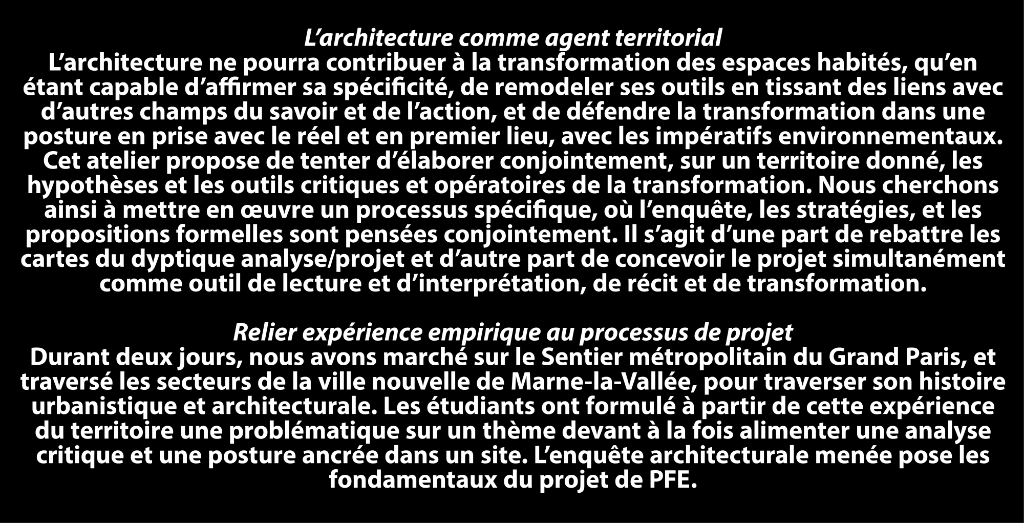 Partant des écrits du philosophe Baptiste Morizot, qui considère que nous faisons face à une crise de nos relations au vivant, nous affirmons que nous devons apprendre à réhabiter, collectivement. Reprenant cette théorie des égards ajustés, nous avons mis en place un gradient d’égards, structurant une stratégie territoriale permettant de penser le maillage et le réseau de l’infrastructure du vivant, et de nous projeter dans cinq situations bien distinctes. En cinq points du territoire de Marne-la-Vallée nous mettons en place différentes stratégies d’égards, liées aux micro-localités, aux pré-existences, vivantes et architecturales des sites choisis : utiliser les dents creuses d’un tissu pavillonnaire pour repenser notre lien avec le vivant comme ressource nourricière à Noisy-le-Grand (Gladys Theilor), penser l’habitat et le soin inter-espèces entre vivant animal et humain dans un ancien hôpital à Lagny-sur-Marne (Coralie Marot), retrouver du lien entre humain et animal dans une relation entre élevage et lieu culturel à Pomponne, dans un objet patrimonial (Marion Ournac), proposer des formes de vie locales et d’activités de loisirs et de tourisme aux abords d’un cours d’eau et de sa ripisylve à Montevrain (Audrey Mainsant), et enfin amplifier l’écosystème particulier d’un milieu humide pour pouvoir le protéger et l’habiter autrement à Coupvray (Mathilde Roux).